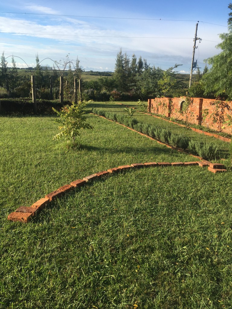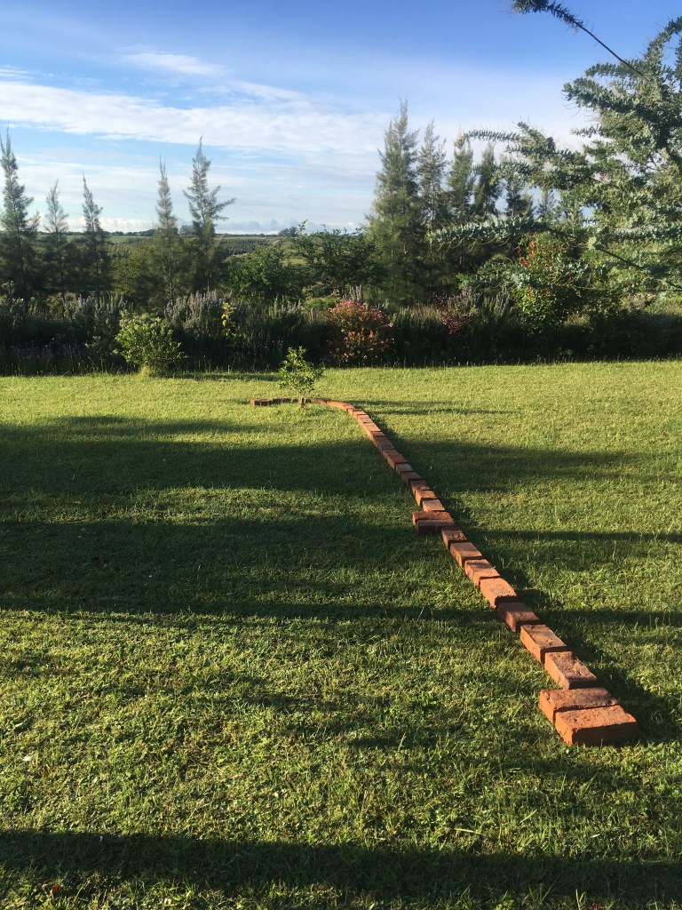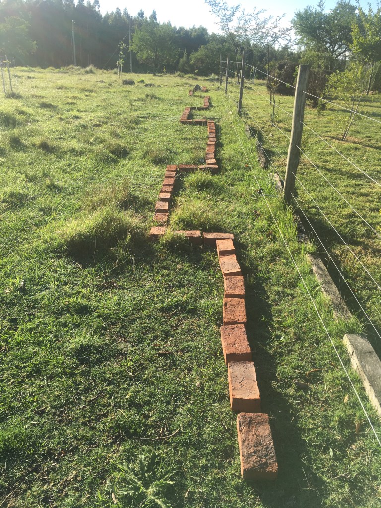 Die Mauer auf dem obigen Foto ist unser bisher größtes Projekt, sie wird etwa 35 Meter lang werden und den Park an der Nordseite zur Schafweide abgrenzen. Hier an dieser Seite ist noch nicht viel gemacht. Wir haben einige Eukalyptus-Bäume auf der Weide gepflanzt, die den Schafen Schatten spenden und den Wind abhalten sollen. Der übergangslose Bereich von Weide und Park, bisher nur durch einen Drahtzaun getrennt, bekommt nun die imposante, ungefähr 1,2Meter hohe Mauer. Dafür werden allerdings die Ziegel nicht ausreichen. Mindestens die doppelte Menge muß dafür noch bestellt werden.