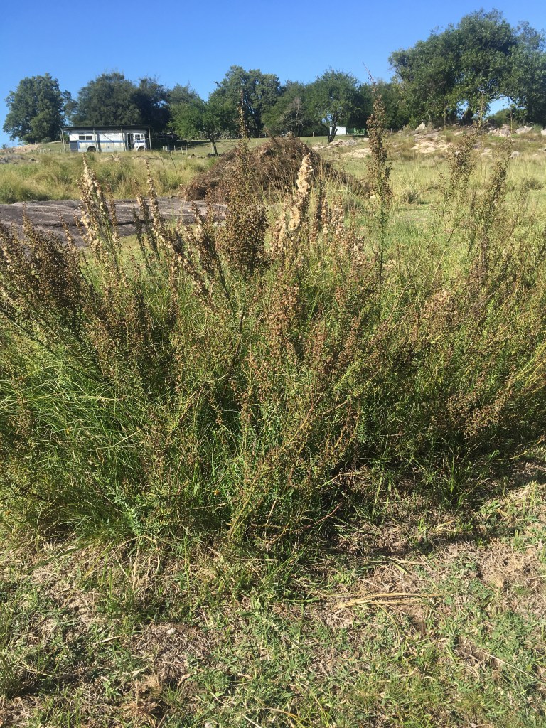 Und eben diese Büsche werden momentan in Handarbeit entfernt; heißt: sie werden ausgerupft und ausgerissen. Sie haben relativ flache Wurzeln und lassen sich mit einiger Kraftanstrengung ganz gut entfernen. Wenn die Wurzeln mit erwischt werden, steht die Chance gut, dass sie nicht erneut austreiben. Anfangs haben wir sie mit der Elektro-Sense abgeschnitten, sie wucherten danach nur um so mehr.