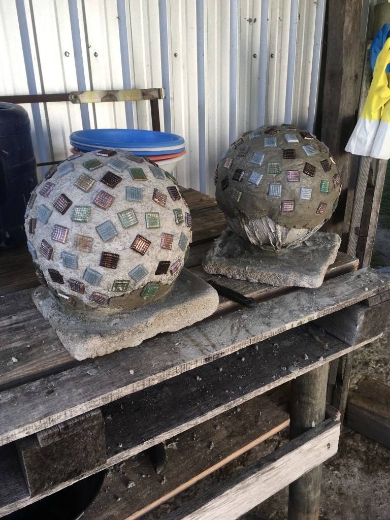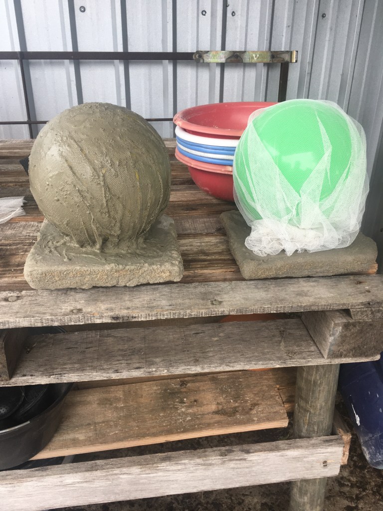 Um dem formfähigen Beton Halt zu geben, wurde zuerst ein in die passende Größe geschnittener Rest Fliegennetz in flüssigen Beton getaucht und danach um den Ball gelegt. Nach einem Tag Trockenzeit konnte dann der Ball mit Beton ummantelt und die Mosaiksteine aufgelegt werden.