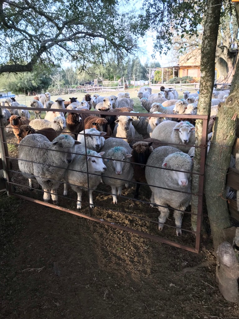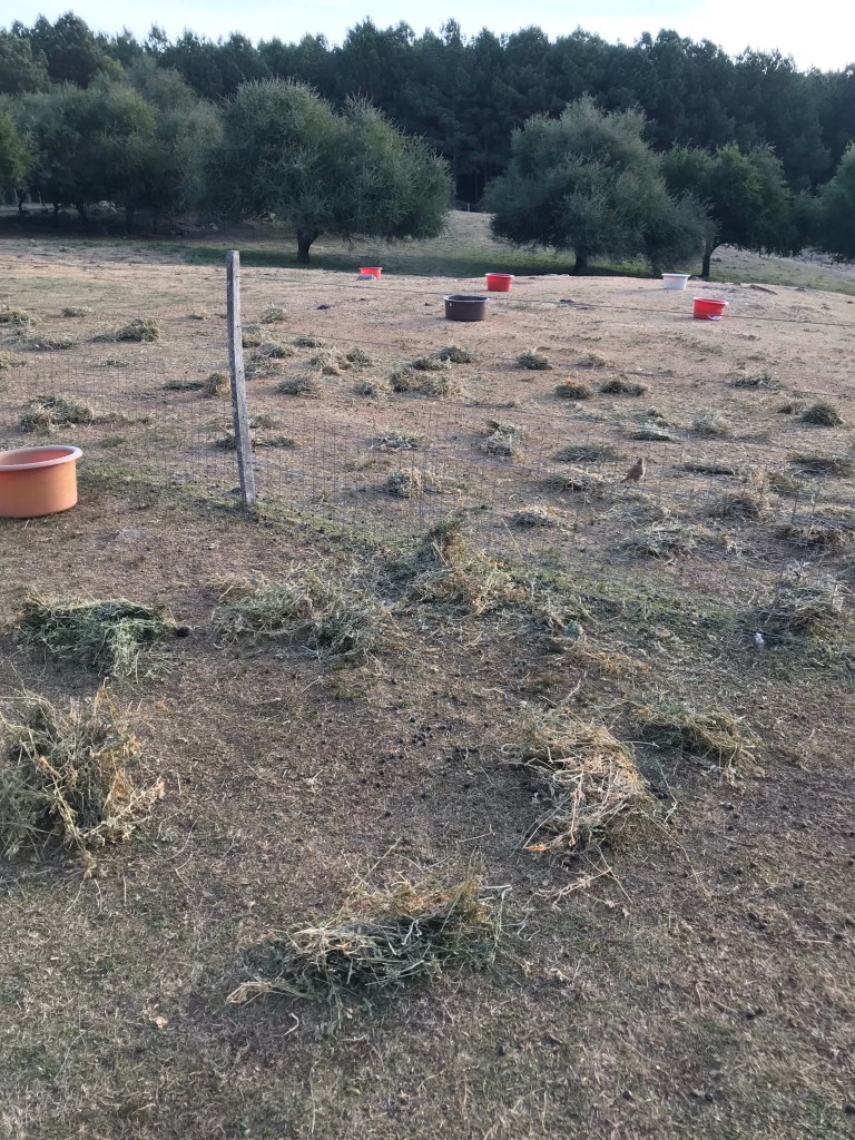 Die Schaf-Damen bekommen am Abend gemahlenen Mais und Alfalfa zugefüttert. Der Mais ist in großen Schüsseln über das Nachtgehege verstreut, das Alfalfa liegt in einem großen Bereich verteilt, damit die Schafe ausreichend Platz haben und nicht übereinander fallen. Die Gier ist groß!!!! Etwas über die Hälfte der Schafe ist trächtig. Das und die nächtlichen Fröste erfordern viele zusätzliche Kalorien.