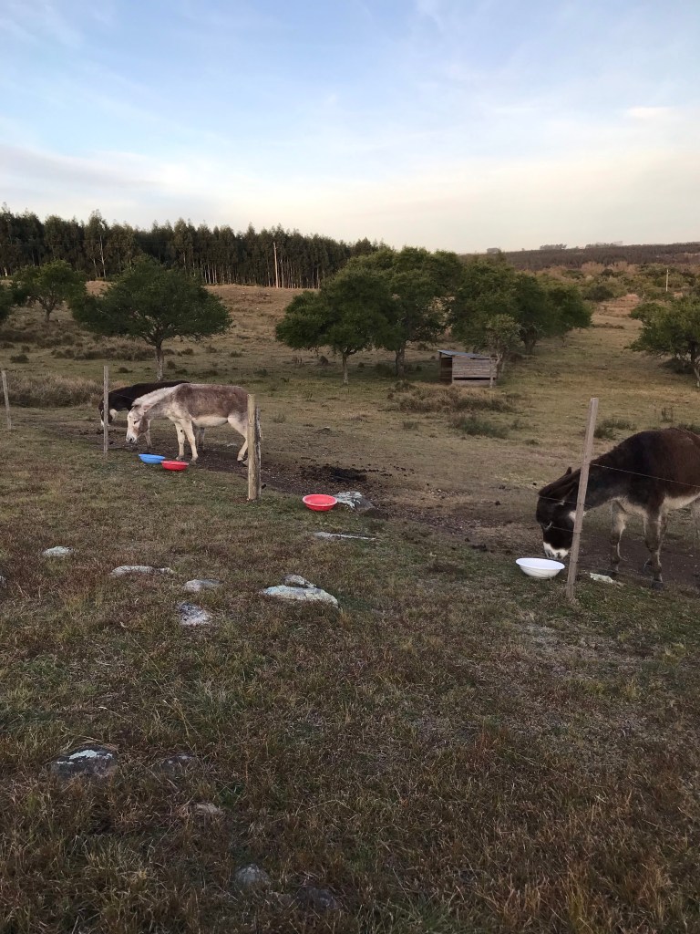 Ganz zum Schluss bekommen die Esel und das Pferd ihre Rationen: jeweils eine Handvoll Hafer und einen Apfel.