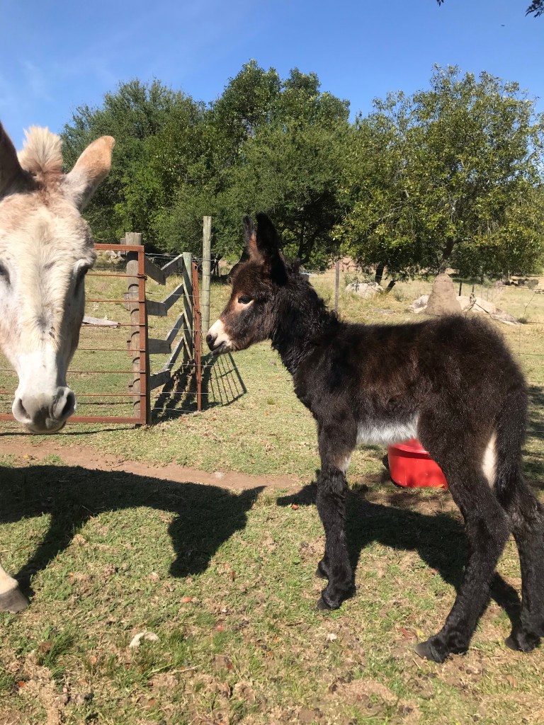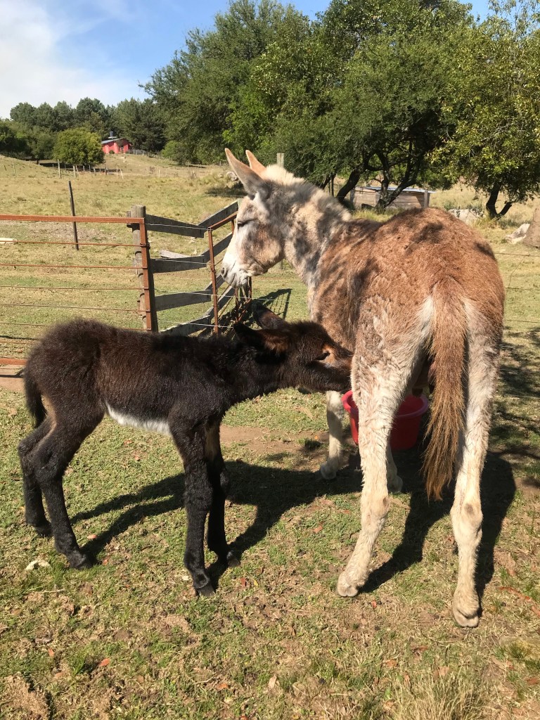 Das Pferd hat sich wieder aufgeführt, als ob das Baby ihm gehört und Mutter und Kind nicht aus den Augen gelassen. Damit die Beiden ihre Ruhe haben, bekamen sie ein Extra-Gehege weit weg von den anderen Eseln und dem Pferd.