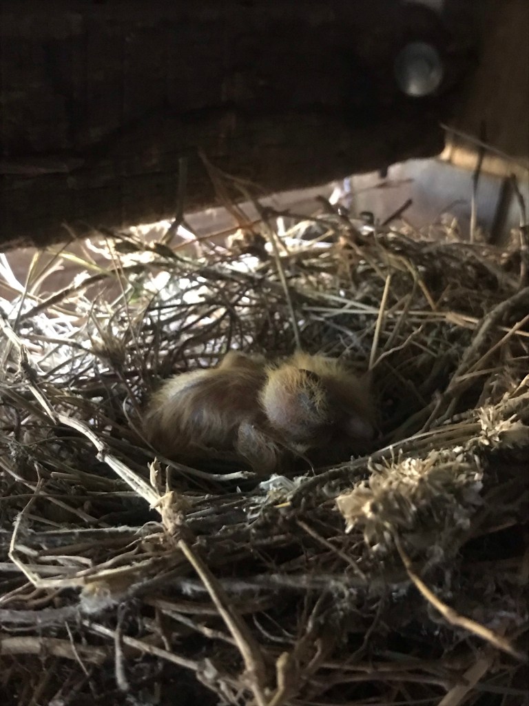 Auch im Hühnerstall, direkt über der Tür, befindet sich ein Nest. Hier ist schon ein kleines Täubchen geschlüpft.