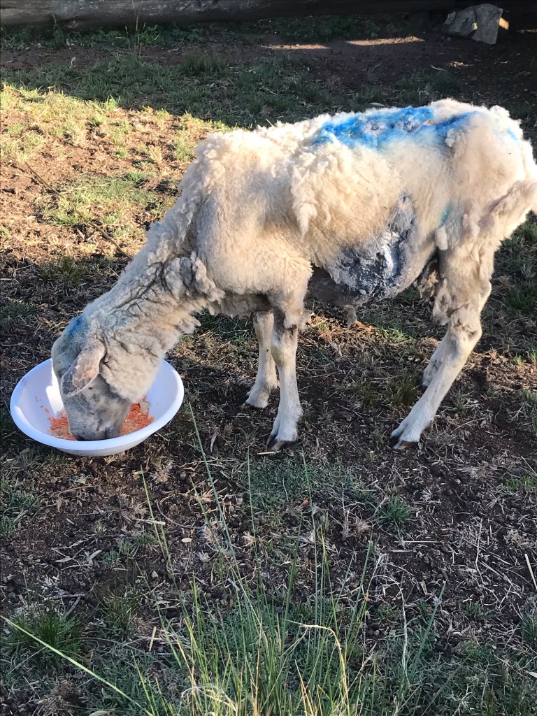 Den blaue Strich an Gudruns Rücken haben wir zum schnelleren Erkennen aufgesprüht. So fanden wir sie nach ihrer Erkrankung aus der Schafherde leichter heraus. Denn es war wichtig zu wissen, dass sie auch jeden Abend wieder von der Weide nach Hause kommt und nicht irgendwo erschöpft liegt. Jetzt, mit der großen Bisswunde, ist sie separat auf der Krankenstation. Die Wunden sind mit Silberspray abgedeckt. So können sie an der Luft gut heilen, ohne dass Fliegen dran gehen.