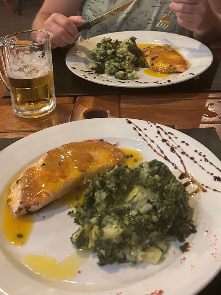 Auch lecker: Lachs mit Kartoffelbrei und Spinat, dazu eine fruchtige Maracuja-Soße! (salsa de maracuya = salsa de maracuscha)