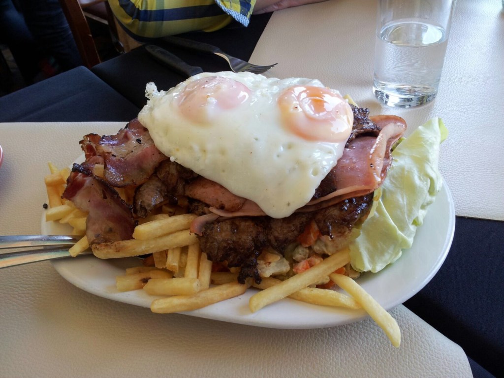 Chivito ( tschibito, das v wird so zwischen b und w ausgesprochen, ) ist das, ja, ich möchte fast behaupten: das Nationalgericht Uruguays. Das muss man einfach probiert haben. Und entgegen der korrekten Übersetzung enthält es kein Ziegenfleisch, sondern eine schöne Scheibe Rinderlende!