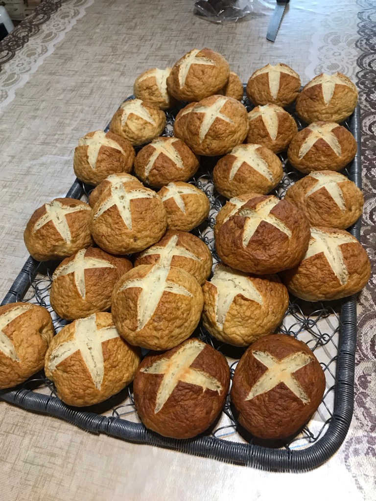 Bei dem ungemütlichen Wetter zieht es mich nicht nach draußen. Lieber stehe ich am warmen Backofen und backe auf Vorrat Brot und Brötchen. Wenn der Wind wieder etwas nachlässt, werden wir draußen auch wieder den Holzofen anfeuern und darin backen.