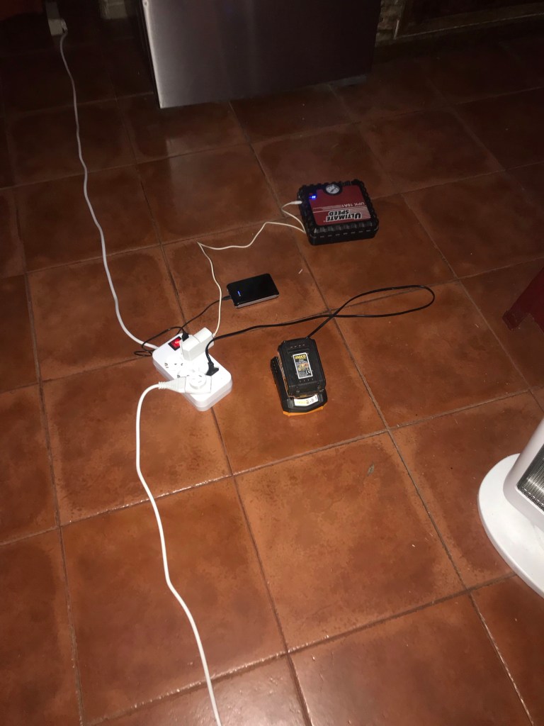Ein ziemlicher Kabelsalat, aber es funktioniert!! Für das Licht habe ich eine praktische Lampe mit austauschbarem Akku, sodass ich nicht im Dunkeln sitzen muss und mein Ofen sorgt für Trockenheit und Wärme.