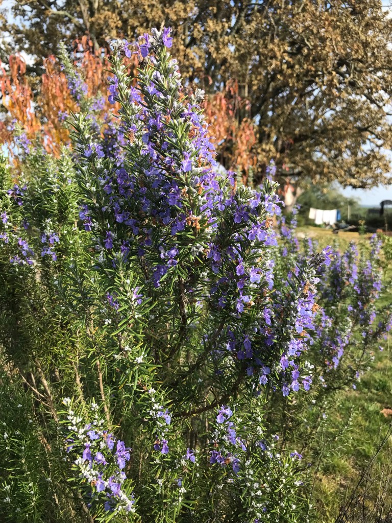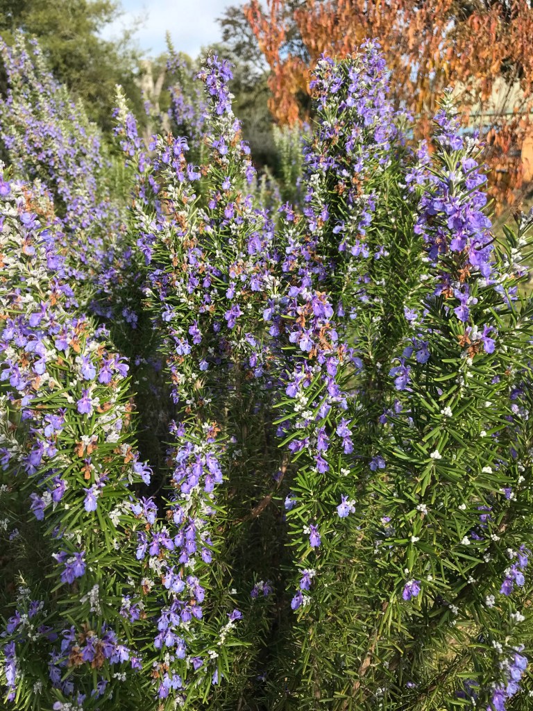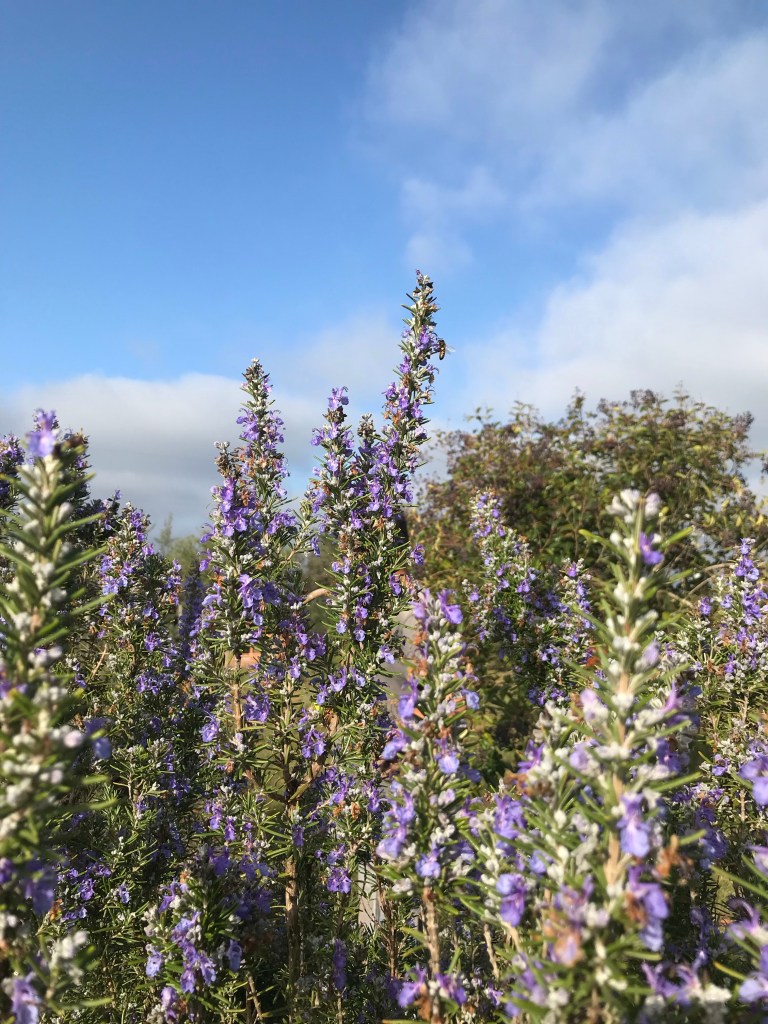 Dem Rosmarin machen die Wetterkapriolen nichts aus. Er zieht die benötigte Feuchtigkeit aus dem morgendlichen Nebel und verwandelt den Park zur Zeit in ein wahres Blütenmeer.