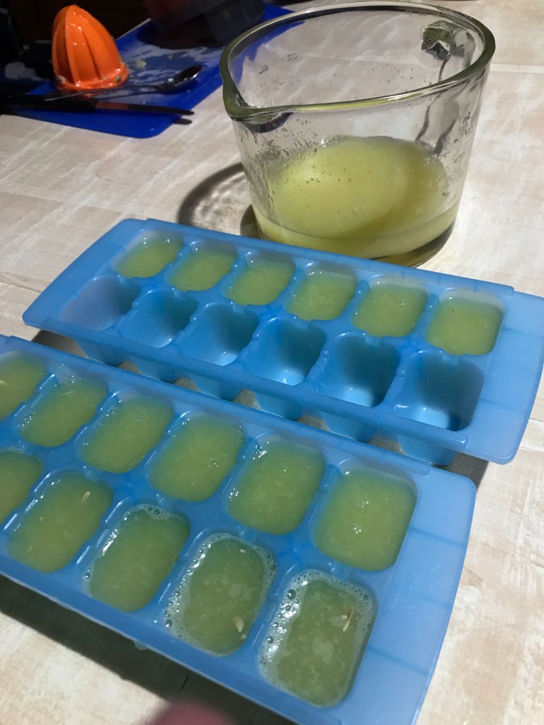 Die Zitronen werden ausgepresst und portionsweise eingefroren. Wir haben in diesem Jahr so viel geerntet, dass wir die nächsten Wochen keine Zitronen mehr kaufen müssen.