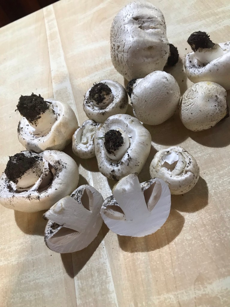 Die Champignons sprießen nur so aus dem Boden. Drei Tage lang brauchten wir sie bei jedem Spaziergang über die Weide nur einsammeln.