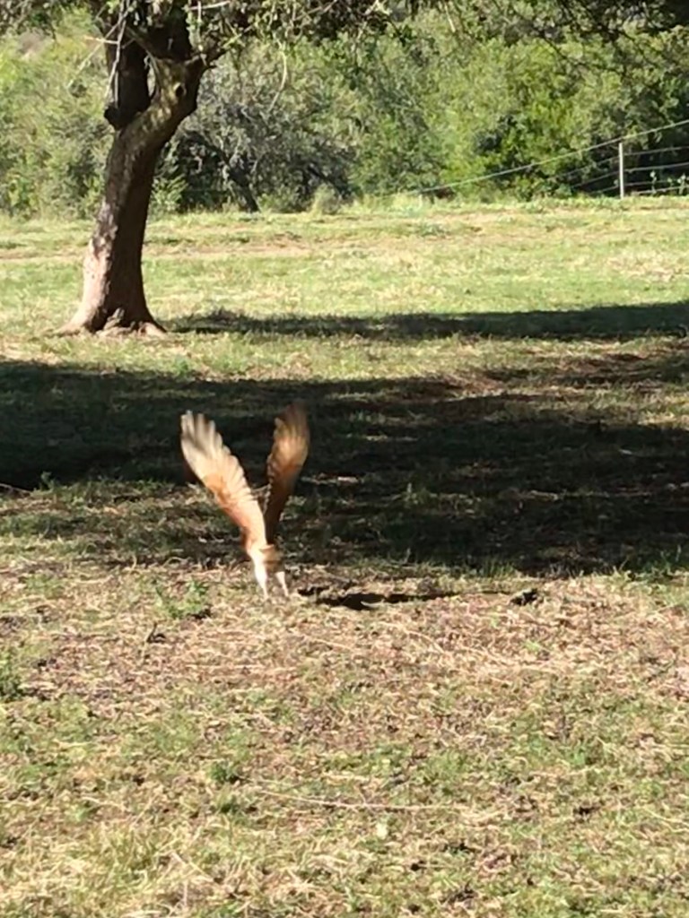 Wir haben seit Anfang an ein Falkenpärchen auf dem Campo, das hier jedes Jahr seine Jungen groß zieht. Die Falken sind an uns gewöhnt, sie sind kaum scheu und kommen bis auf wenige Meter an uns heran. Sie lieben, ebenso wie wir, die Schafweide. Vor allem, wenn kleine Lämmer unterwegs sind. Die Ausscheidungen der Lämmer, die in den ersten drei/ vier Wochen ausschließlich von Milch ernährt werden, scheint ein richtiger Leckerbissen zu sein und zur Aufzucht der eigenen Brut hervorragend geeignet. Wenn wir frische Lämmer haben, sind die Falken fast den ganzen Tag zwischen den Schafen unterwegs, sitzen oft auf deren Rücken und lassen sich spazieren tragen.