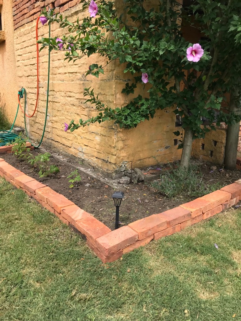 Nach und nach werden die Steine nun wieder weggeschafft, an den Zaun der Grundstücksgrenze. Dort stören sie nicht. Stattdessen kommen zwei Reihen Ziegel als Beetbegrenzung zum Einsatz. Wir haben saubere Kanten, die sich mit der Motorsense in minutenschnelle säubern lassen. Nichts wächst mehr ein, ich muss nicht mehr dauernd auf den Knien rutschen und spare mir damit viel Zeit.