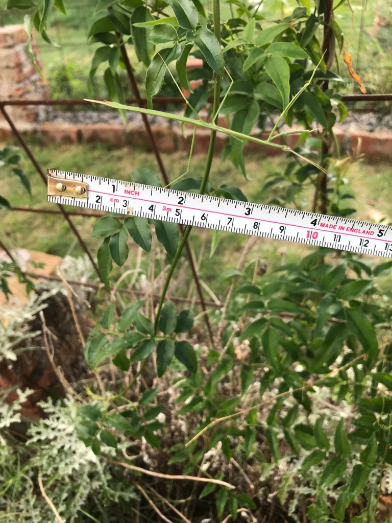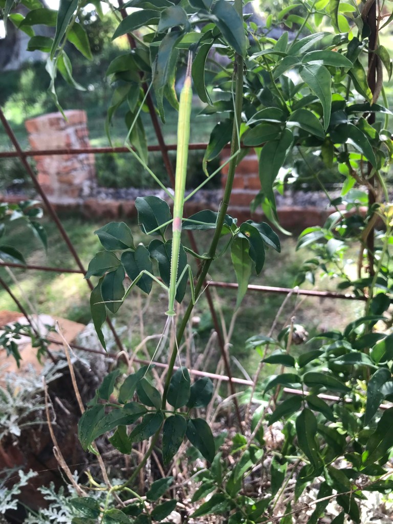 Obwohl wir nicht in einer tropischen Zone wohnen, haben wir allerlei Stabheuschrecken im Park. Sie sind grün, hellbraun oder beige in unterschiedlichen Größen. Gut getarnt zwischen Blättern und Ästen sind sie kaum zu entdecken. Nur wenn man ihnen zufällig zu nahe kommt, was mir eigentlich täglich beim Gießen passiert, kann man sie entdecken und die interessanten Tierchen eine Weile beobachten. Zwei, drei langsame Zuckungen mit den Beinen, dann verfallen sie wieder in die Bewegungslosigkeit.
