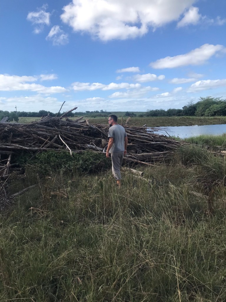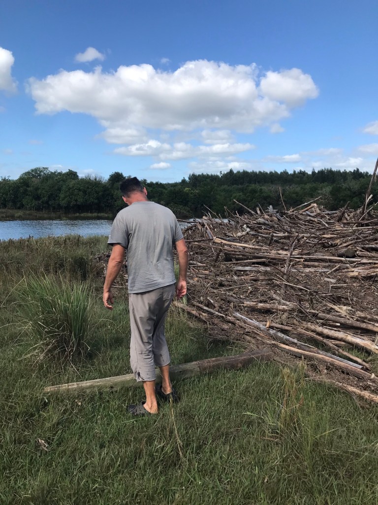 Zurück blieben 2-3 Meter hohe Holzhäufen. Auf der Überschwemmungsfläche fanden wir weit verstreut unsere Pfosten wieder.