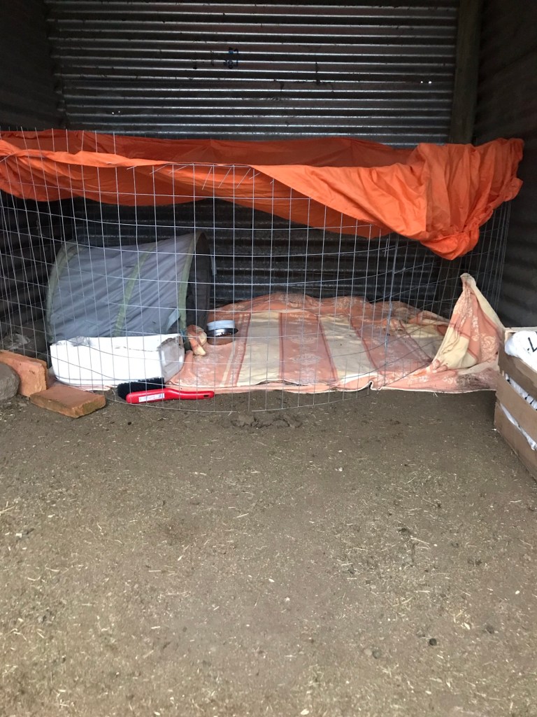 Ich baute ihr in einer der Schafunterstände eine sichere Kuschelhöhle. Die Hütte lässt sich durch ein Gitter verschließen, im Innern stellten wir einen Käfig auf. So sollte die Katze auch in der Nacht vor Feinden ( Marder, Stinktier o.ä.) geschützt sein. MiezMiez nahm ihr neues Zuhause dankbar an und verkroch sich.
