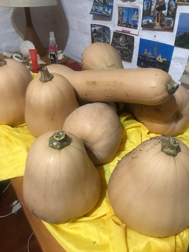 Das Wetter meinte es gut mit uns! Die bis in den Herbst hinein hohen Temperaturen und der reichliche Regen sorgten bei den Kürbissen noch einmal für einen Wachstumsschub. Für jeden Monat haben wir einen großen Kürbis, bis im nächsten Jahr die nächste Generation nachgereift ist.
