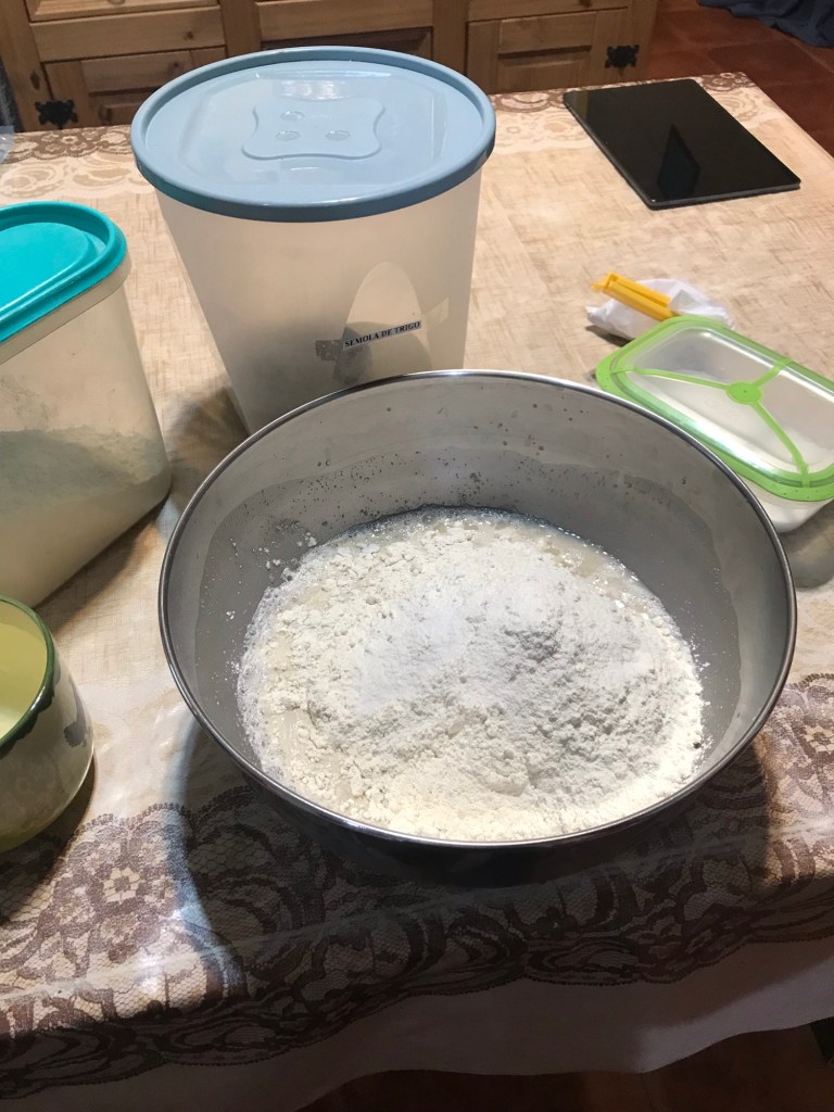 In der Schüssel 200ml warmes Wasser, ein Teelöffel Honig und ein Päckchen Trockenhefe mit dem Schneebesen verrühren. Danach etwa 600gr. Weizenmehl, 2 Eßl. Olivenöl, 1Eßl. Salz und 150gr. Hartweizengrieß dazugeben und mit der Hand oder einem Küchengerät verrühren. Soviel warmes Wasser zugeben, bis ein weicher, geschmeidiger Teig entstanden ist.