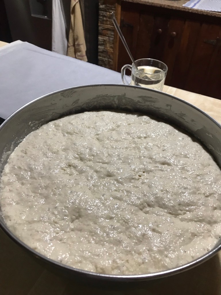 Das war‘s dann auch schon mit der Arbeit. Der Teig bleibt in der Schüssel, wird mit Klarsichtfolie und einem Handtuch abgedeckt und darf an einem kühlen Ort ~12Std. ruhen.