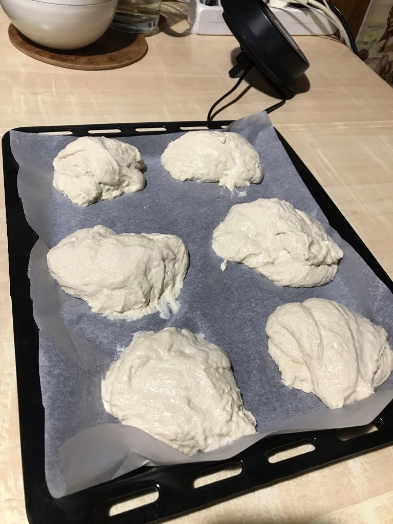 Nach 12Std. hat der Teig ordentlich Blasen geschlagen. Nun den Backofen auf 240 Grad vorheizen und das Backblech mit Backpapier belegen. Eine Tasse mit Wasser und einem Eßlöffel bereitstellen. Den Löffel in das Wasser tauchen und aus dem Teig Nocken stechen, auf das Blech verteilen und ab damit in den heißen Ofen.