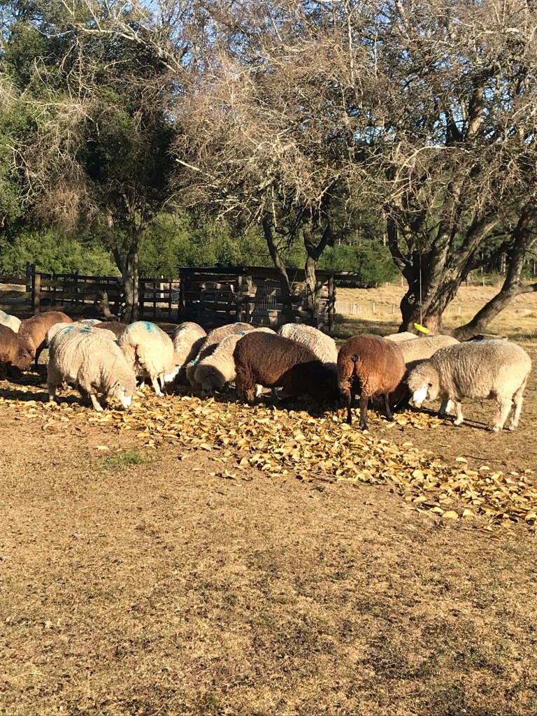 Das Laub zu entsorgen ist hingegen kein Problem. Jedes Blatt, das der Wind auf die Weide weht, wird, kaum das es den Boden berührt, von den wartenden Schafen gefressen. Jeden Tag bin ich mit dem großen Rechen unterwegs, fülle 2-3 Säcke voll mit Laub und erfreue damit meine Schäfchen, die schon darauf warten und ungeduldig blöken. Es scheint ein ganz besonderer Leckerbissen zu sein. Während ein Großteil der Herde am Morgen auf die Weide spaziert, bleiben immer mindestens 2 Schafe oben in der Nähe des Zauns und warten, bis ich mit den Blättern komme. Dann genügt ein lautes „MähMäh“ und die gesamte Herde rennt wieder nach oben und stürzt sich auf den Laubhaufen.