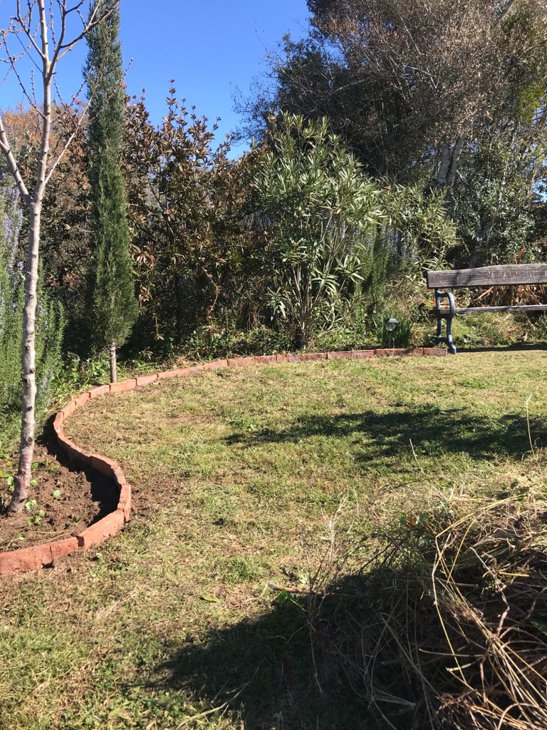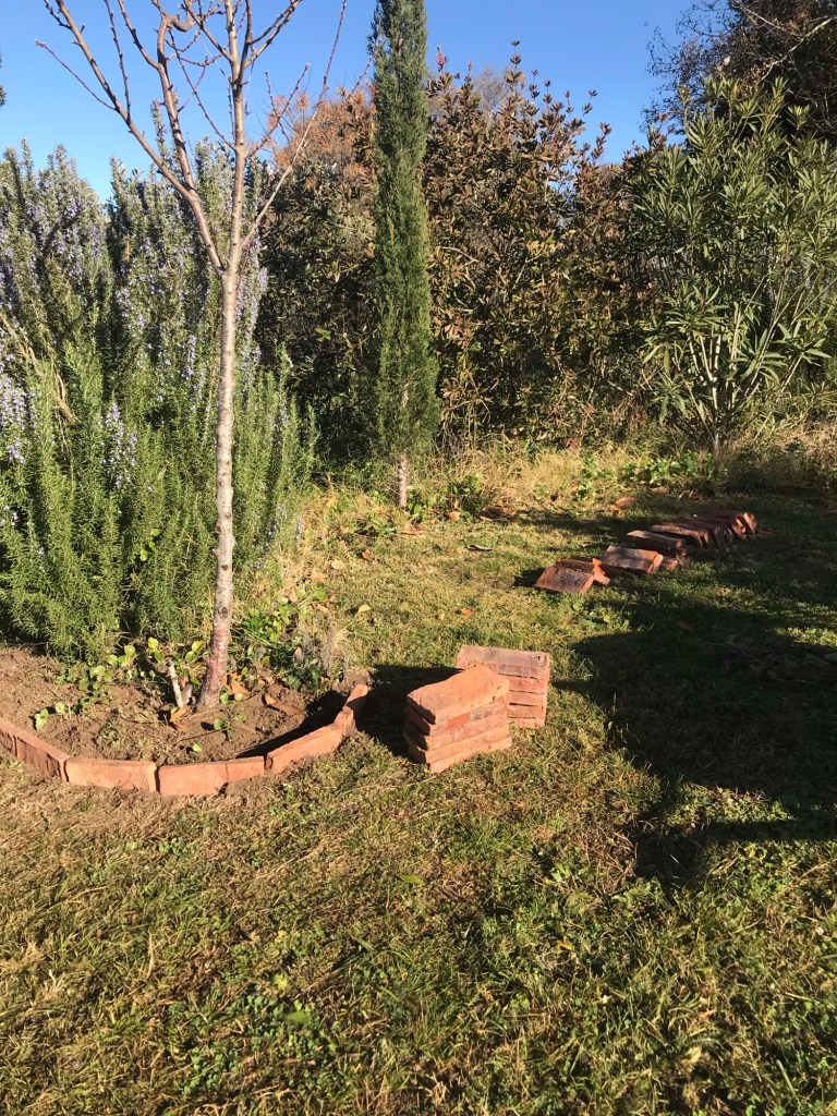 Zwischenzeitlich bekamen wie wieder eine Ziegellieferung. Die rund 800 Ziegel wurden innerhalb nur weniger Tage verarbeitet. Wir haben damit Beetränder befestigt und weitere kleine Mäuerchen angelegt.