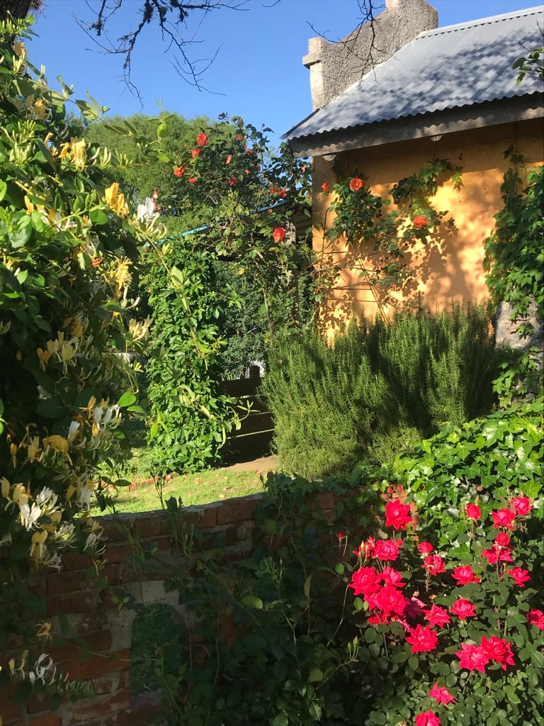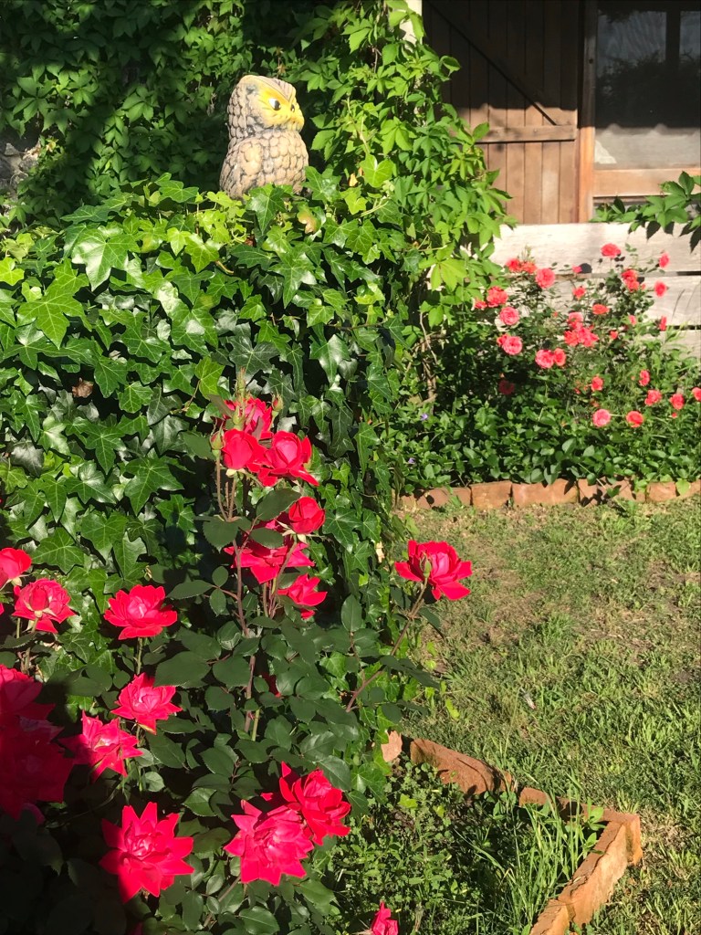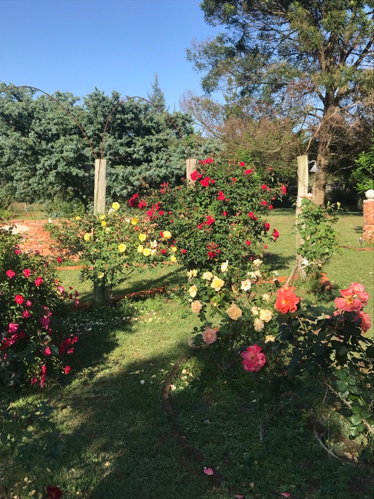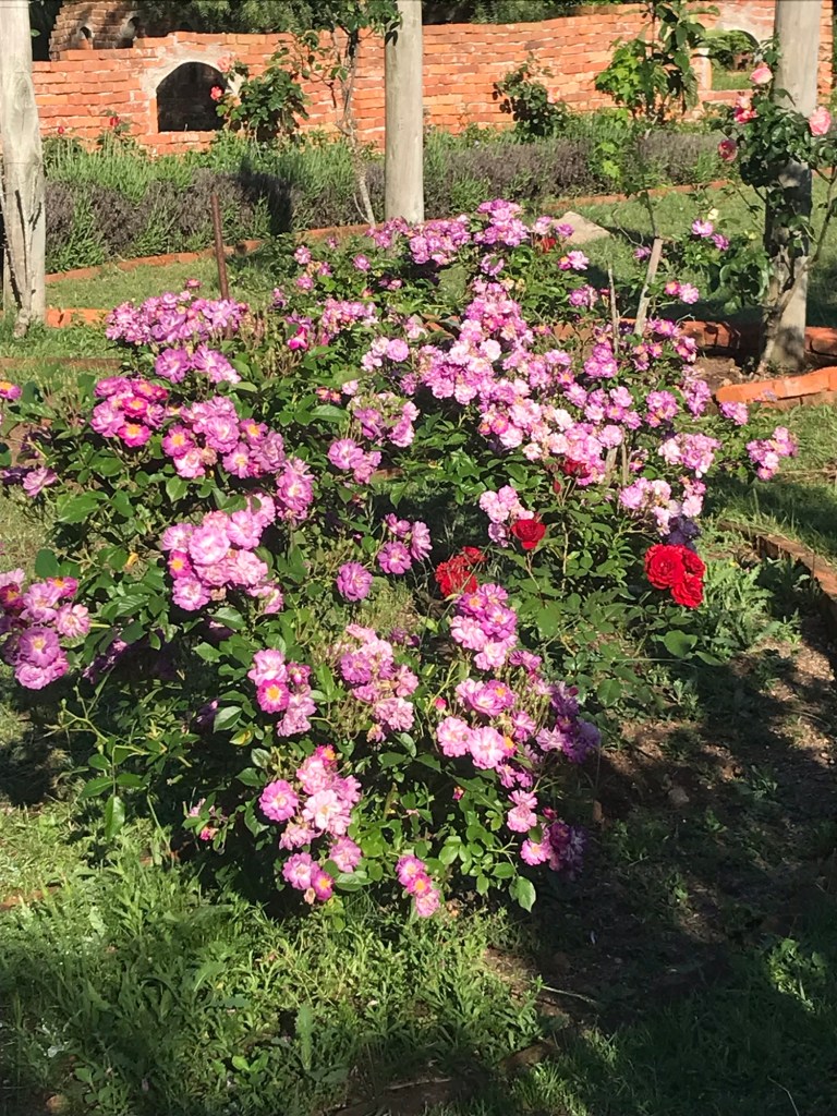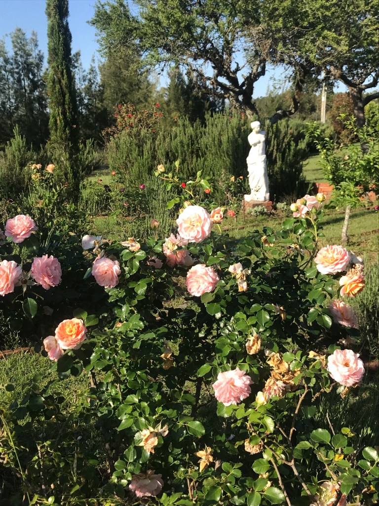 Und der Morgentau glitzert auf den Rosenblüten.