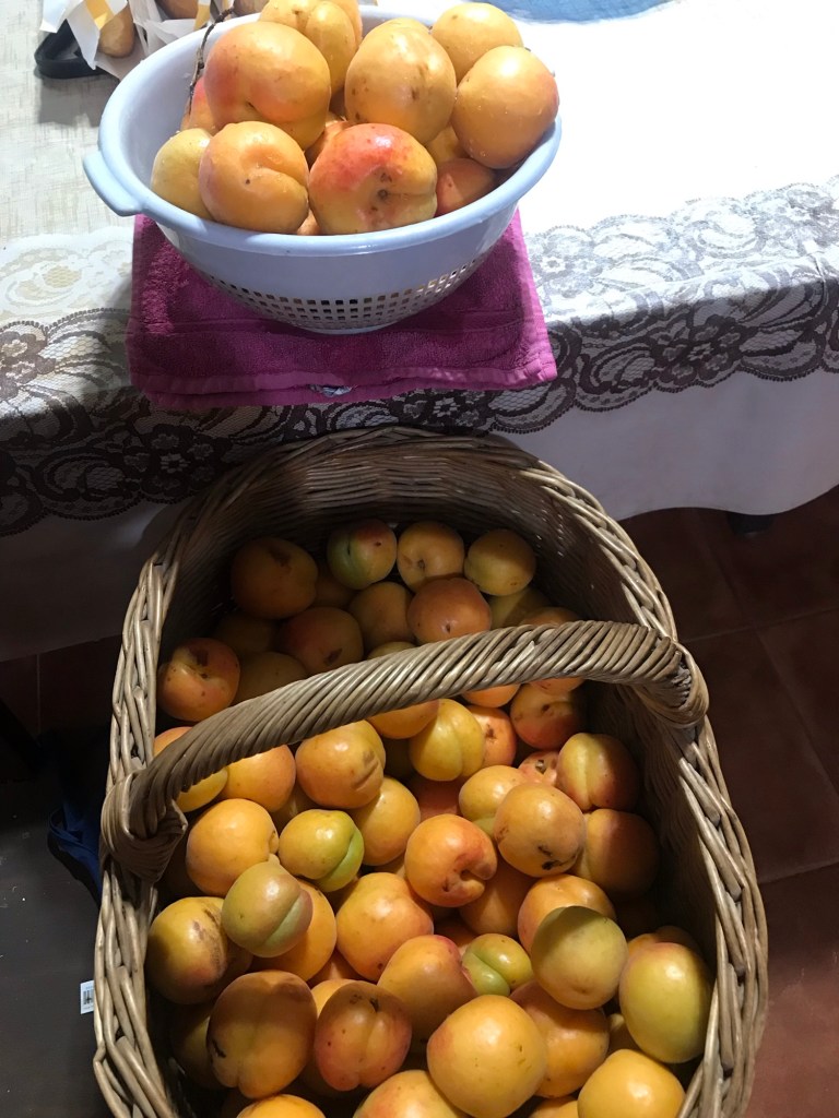 Die Aprikosen liegen schon entsteint und kleingeschnitten in der Tiefkühltruhe. Die Menge fiel in diesem Jahr nicht ganz so üppig aus wie im letzten, die Bäume brauchen etwas Erholung. Da in den Regalen aber noch einige Gläser Marmelade und Eingemachtes vom Vorjahr stehen, konnte ich mir diese Arbeit dieses Mal sparen. Die eingefrorenen Aprikosen landen jeden Morgen im Müsli.