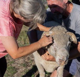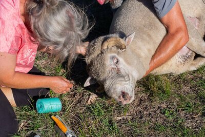 Nun ist unser Philip ein recht zugänglicher Zeitgenosse, so dass die Behandlung schnell vonstatten ging. Er ist handzahm, liebenswürdig und ein absoluter Einzelgänger. Er liebt sein Gehege und duldet kein anderes Schaf darauf! Die sechs Weibchen, die wir ihm zum Beglücken dazu gestellt hatten, waren ihm schon ein Graus! Er arbeitete flugs seine Pflicht ab und verzog sich dann in die hinterste Ecke, um in Ruhe zu dösen. Nur keinen Stress 😁