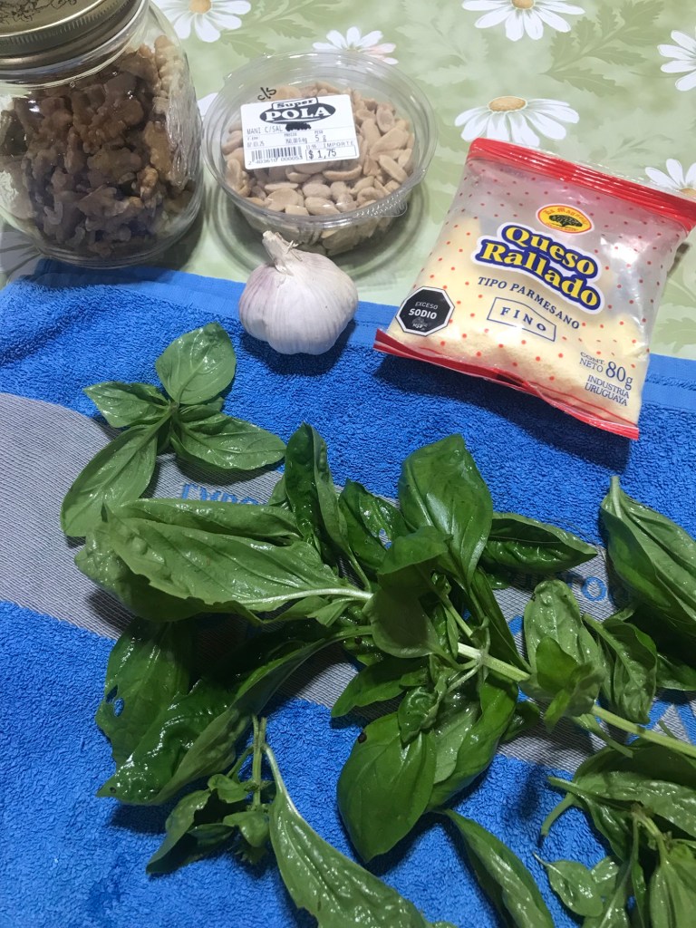 Pinienkerne gibt es hier nicht zu kaufen, aber mit gesalzenen Erdnüssen und einer handvoll Walnüsse schmeckt das Pesto ebensogut. Einige Zehen Knoblauch kommen dazu und eine Prise Salz, dann wird das Ganze mit ordentlich Olivenöl im Mixer pürriert.