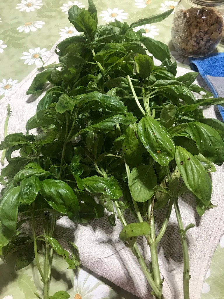 Jetzt habe ich zwischen dem hohen Unkraut im Beet doch tatsächlich dicke Büschel Basilikum entdeckt. Still und heimlich ist er gewachsen, völlig biologisch und daher nicht vegan! Unzählige Insekten, Käfer, Heuschrecken und Läuse haben sich in meinen Pflanzen häuslich niedergelassen und bedient…..und es sich gut gehen lassen! Aber es ist noch eine ganze Menge übrig! Ich habe die Stängel unter fliesendem Wasser ordentlich gewaschen, angefressene Blätter entfernt und dann alles unter dem Ventilator getrocknet.