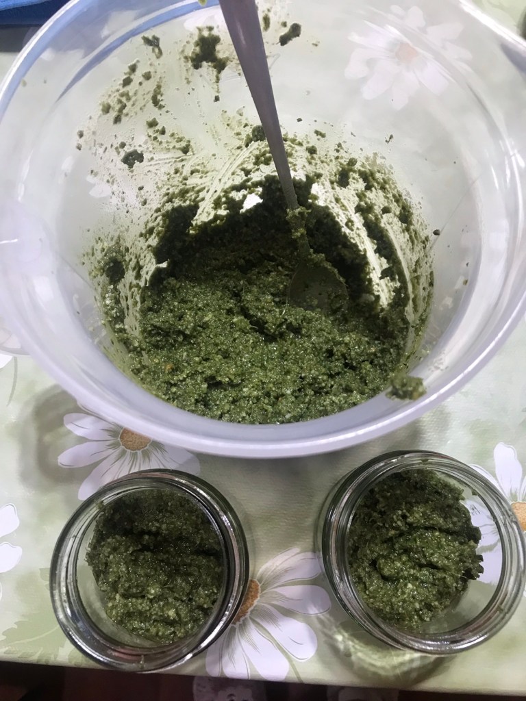 Das fertige Pesto wird in Gläser abgefüllt und eingefroren. Hier hält es sich lange frisch und kann auch noch nach Monaten genossen werden.