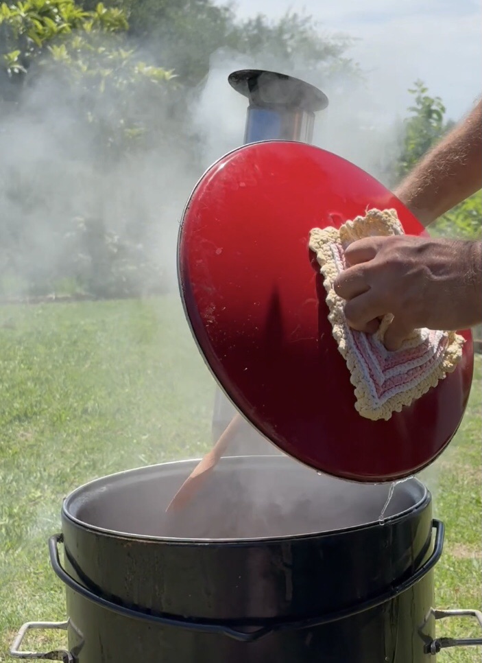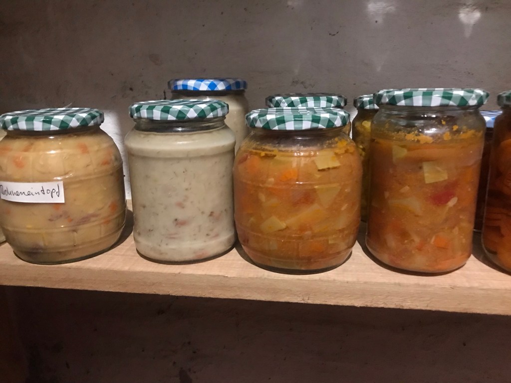 Unser großer Topf wird regelmäßig in Betrieb genommen. Ob Erbsen-, Linsen- oder Bohneneintopf, Gulasch oder Bündner Gerstensuppe: alles wird in großen Mengen hergestellt und später noch einmal für den Vorrat in Gläser abgefüllt und eingekocht.