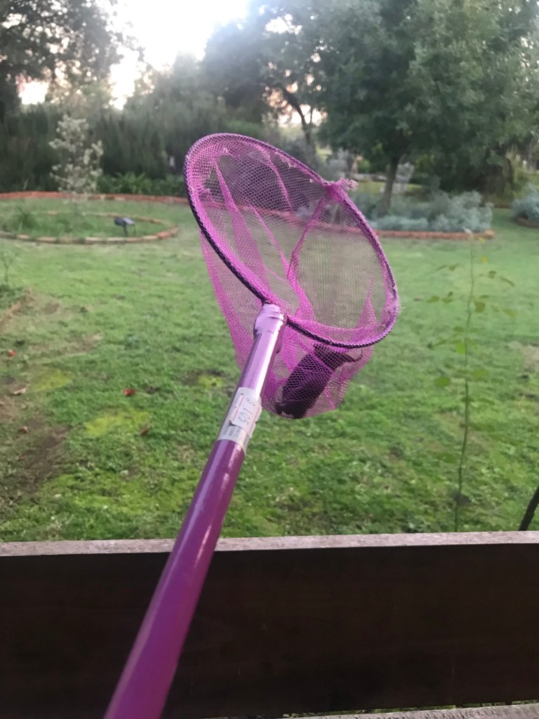 Der kleine Käscher liegt immer griffbereit. Damit lassen sich die Fledermäuse ruckzuck fangen. Wir haben inzwischen Routine😁.