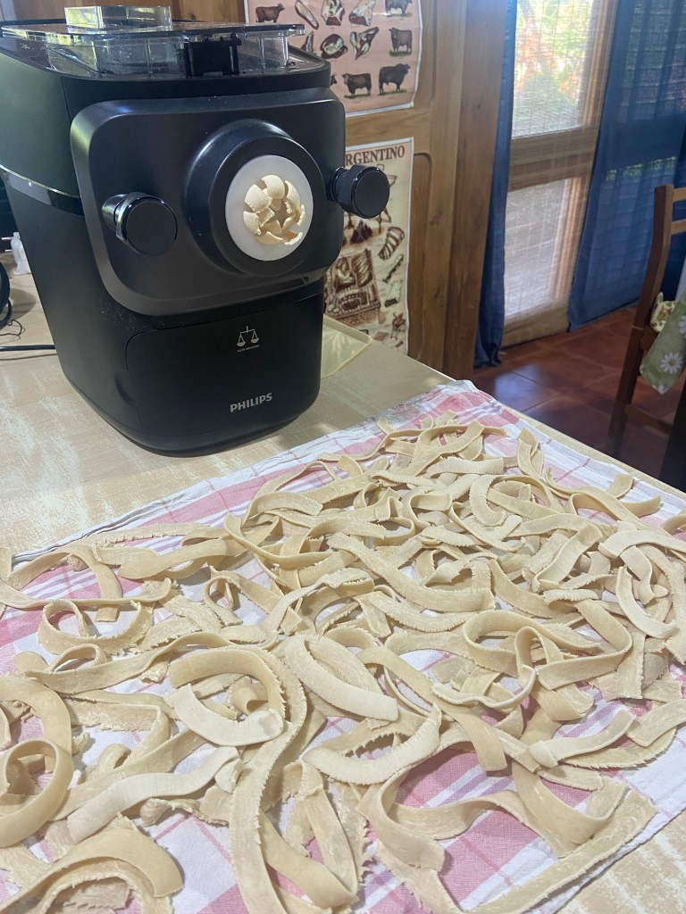 Während das Wasser im Topf auf dem Herd erhitzte, wog, knetete und presste die Maschine schöne Nudeln, die nach der Herstellung im sprudelndem Wasser landeten. Und das alles auf Knopfdruck innerhalb weniger Minuten. Herrlich!