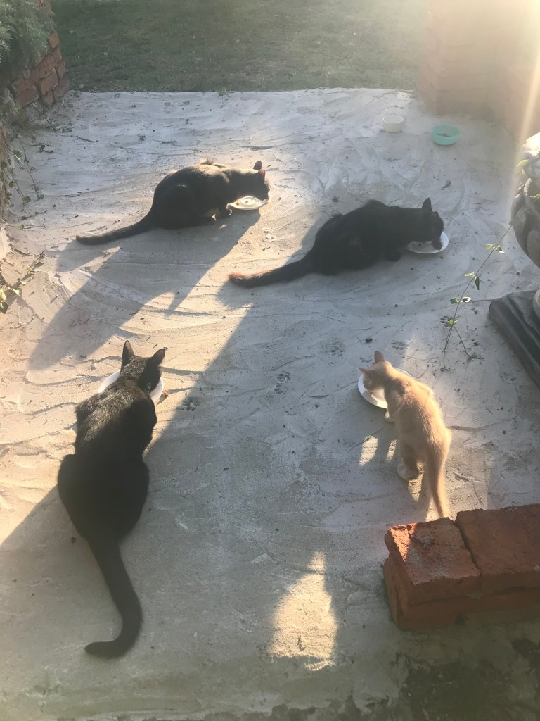 Unsere Vier verstehen sich gut, vor allem die drei Kater harmonieren miteinander und entwickeln sich langsam zu behäbigen Garfields, obwohl sie auf dem Gelände ja eigentlich genug Auslauf und Bewegung haben.