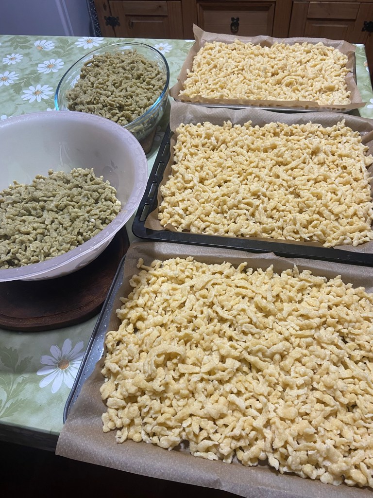 Ich machte mich also ans Werk und produzierte Knöpfle, eine kleine Variante der schwäbischen Spätzle, die sich gut einfrieren und vielseitig verwenden lassen. 36 Eier waren so in kürzester Zeit verarbeitet und die Tiefkühltruhe für den Vorrat gefüllt.