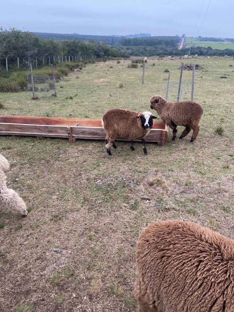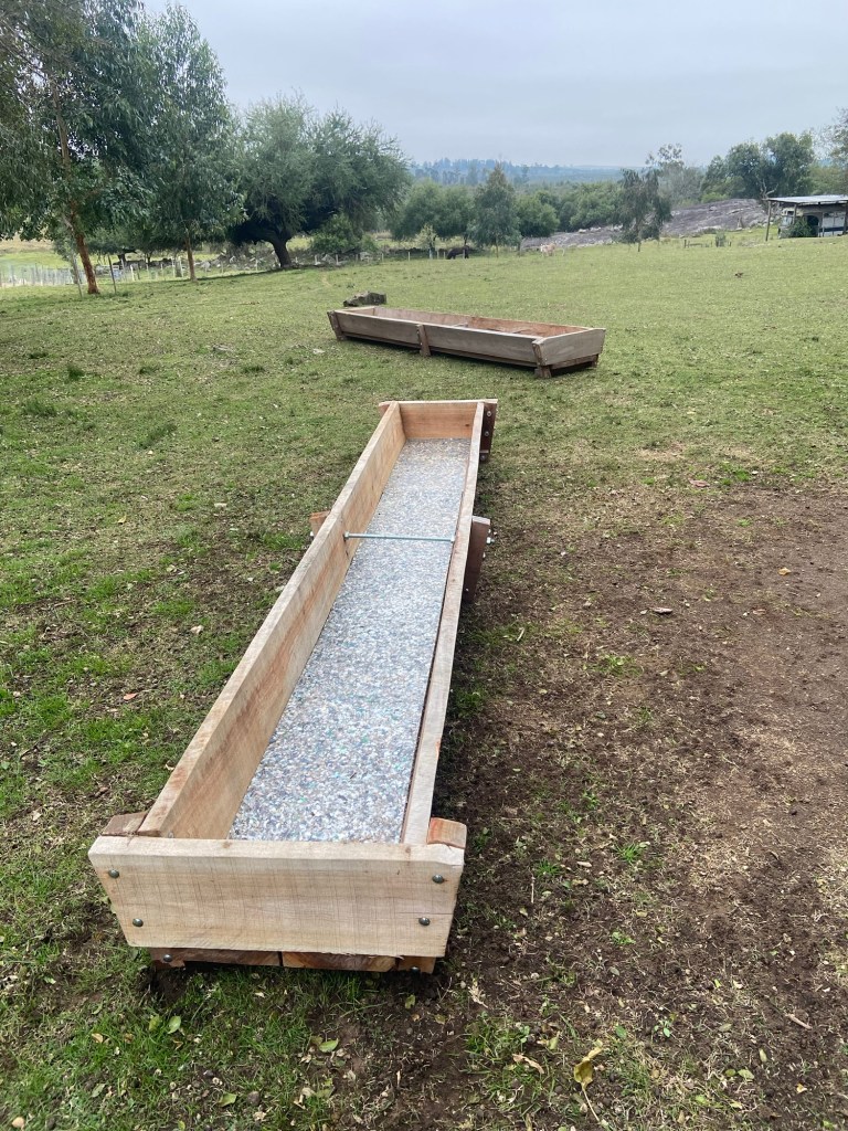 Letzte Woche entdeckten wir am Straßenrand in Tarariras dann die hölzernen Tröge. Die würden uns die Arbeit erheblich erleichtern! Steffen fuhr also noch mal hin und bestellte 4 Stück. Da er sie gleich komplett bezahlte ( das ist hier leider nicht immer üblich) und der Inhaber Zeit hatte, wurden die schweren Teile einige Stunden später geliefert.