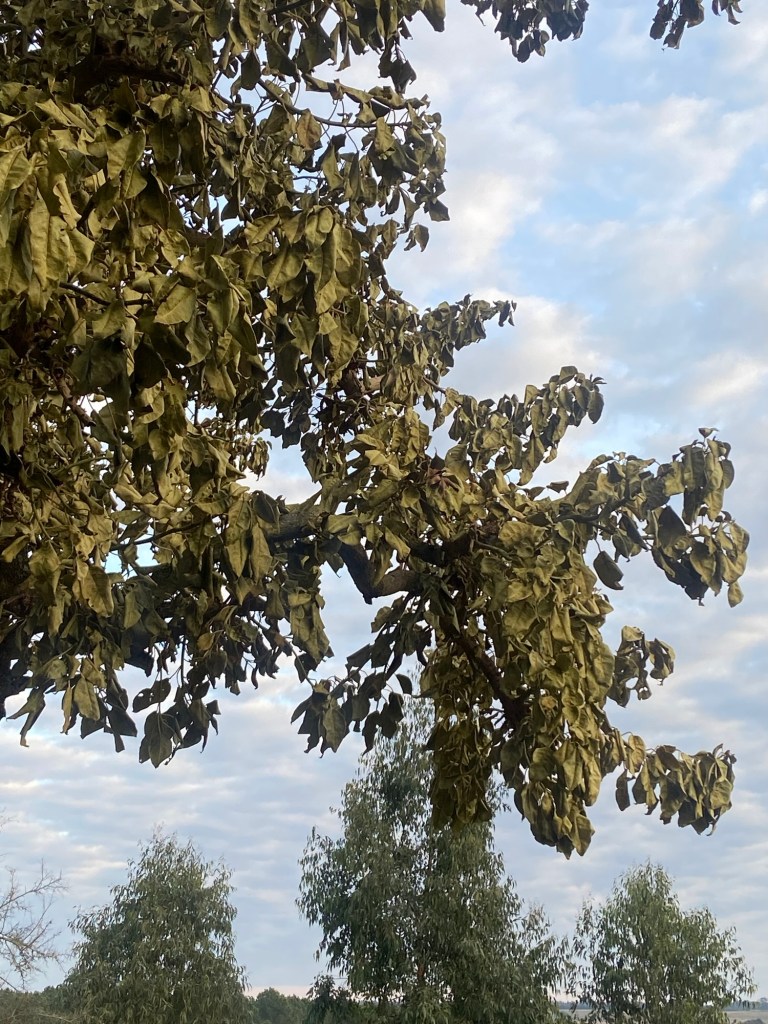 Der Frost hat auch unseren Ombu-Bäumen zugesetzt. Die nächsten Tage werden sie ihr Laub verlieren. Für uns viel Arbeit mit dem Einsammeln der Blätter, für die Schafe ein üppiges Zusatzfutter.