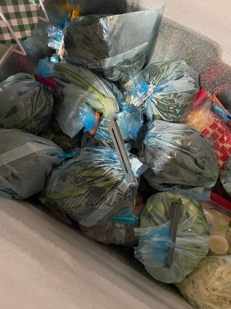 Das Grünzeug daran war knackfrisch. Natürlich hätten wir dafür Abnehmer. Unsere Tiere wären sicherlich nicht abgeneigt. Aber das war mir zu schade. Ich habe jeweils einen Broccoli inklusive Grünzeug ungewaschen in eine Tüte gepackt und ab damit in die Tiefkühltruhe. Unter fließendem Wasser wird er erst beim Auftauen gewaschen, damit sich während der Tiefkühlzeit keine Eiskristalle bilden.