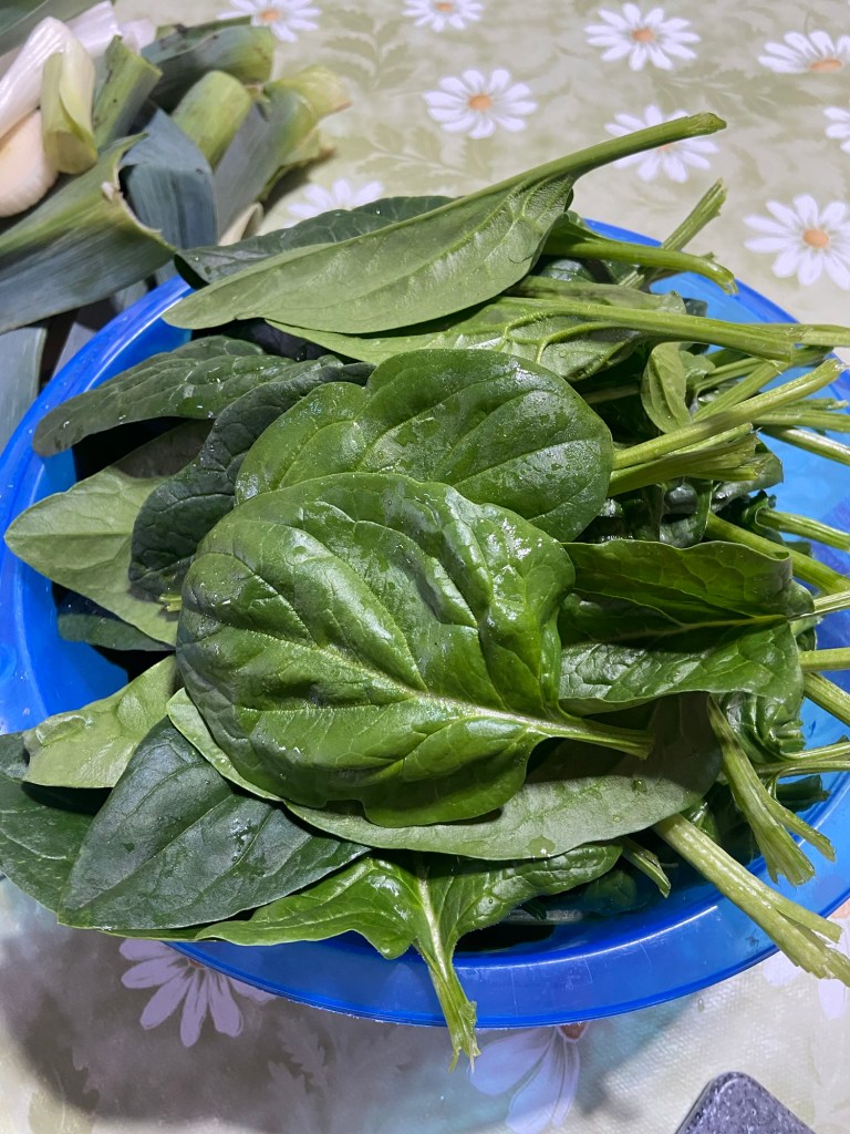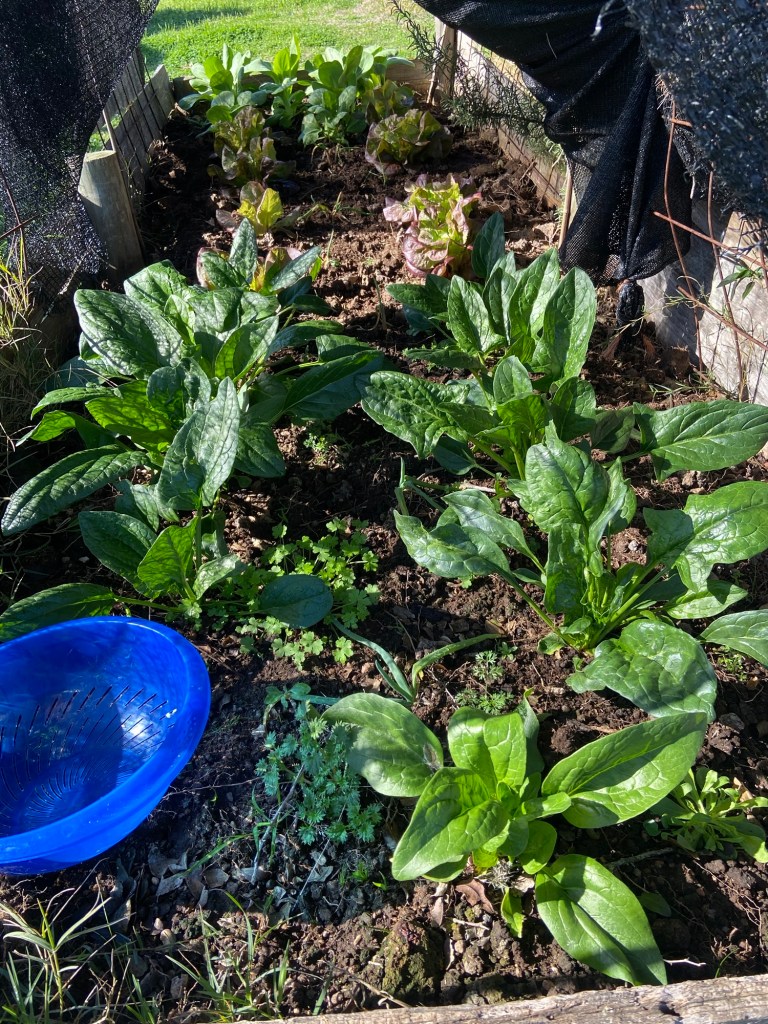 Unsere drei Hochbeete liefern uns täglich frischen Salat und Gemüse. Heute habe ich Spinat geerntet.