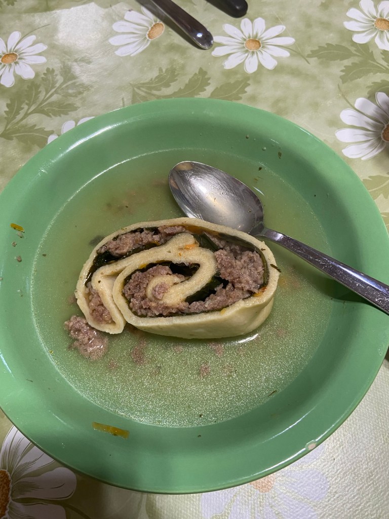 Meine Maultasche wurde mit Spinat, geraspelten Karotten und Hackfleisch gefüllt, kräftig gewürzt und in Fleischbrühe gegart.