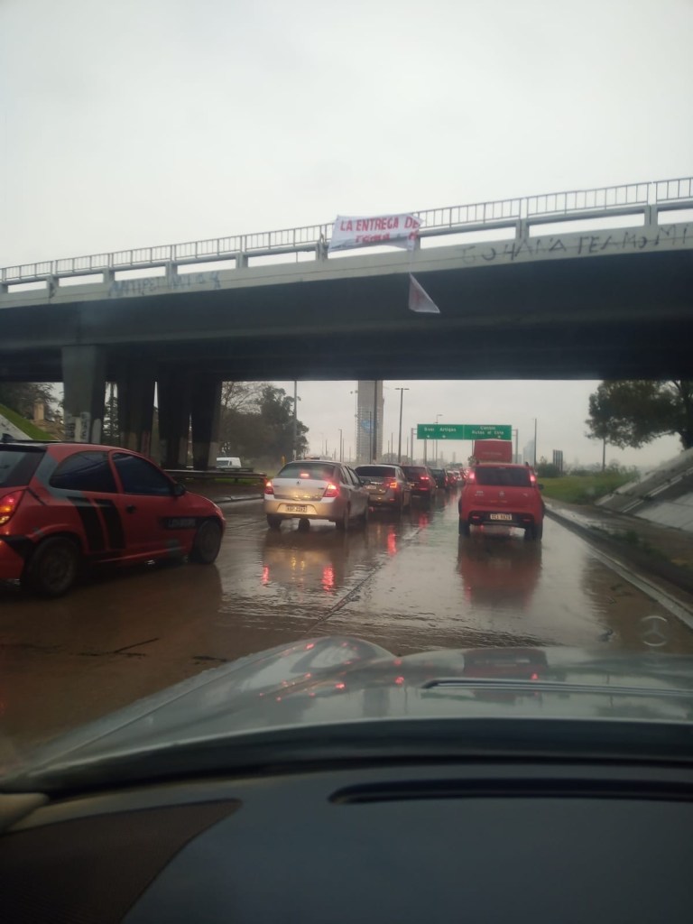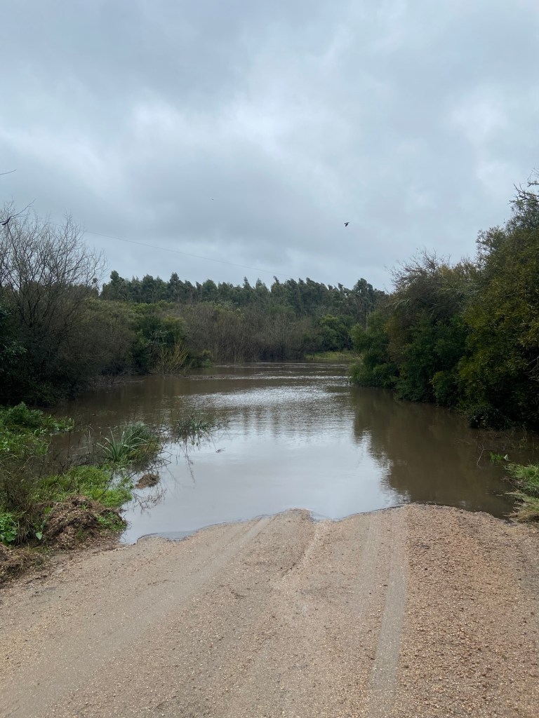 Mit dem ganzen vorbereiteten Papierkram, was man alles braucht, bekommt man bei der Terminvergabe mitgeteilt, habe ich mich heute also auf den Weg nach Montevideo gemacht. Steffen hat das schon gestern erledigt. Da unsere drei Flaschenlämmer tagsüber gefüttert werden müssen, konnten wir nur einzeln fahren. Nun hat es ja die letzten beiden Tage ziemlich geschüttet und wie erwartet, hat das Hochwasser die Brücke unpassierbar gemacht. Wir mussten also einen Umweg fahren.