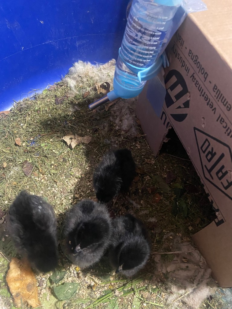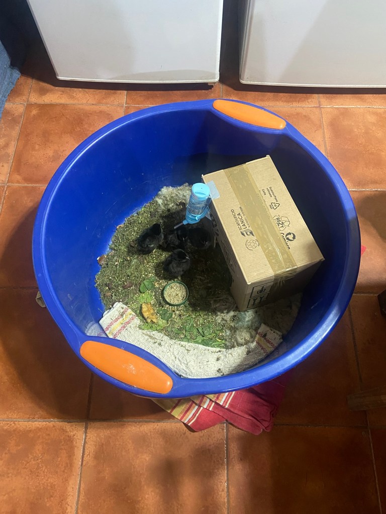 Die erste Woche verbringen sie im Haus und dürfen ab morgen stundenweise nach draußen in ein kleines Gehege auf der Wiese. Die Temperaturen sind hoch genug, sodass ich auf eine Wärmelampe verzichten kann.