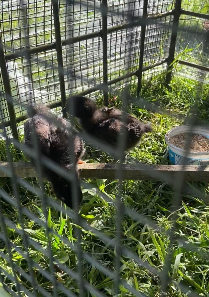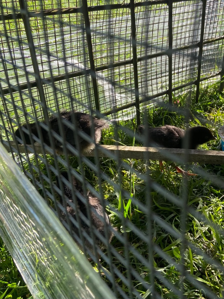 Tagsüber sind sie in einem kleinen Käfig draußen auf der Wiese. Gegen den Wind habe ich den Käfig mit Frischhaltefolie umwickelt. So sind sie geschützt und haben es warm.