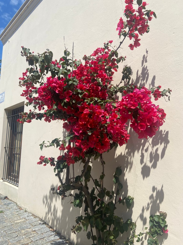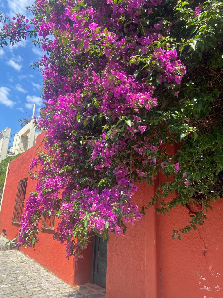 Überall an den Häusern wachsen farbenfrohe Pflanzen empor.