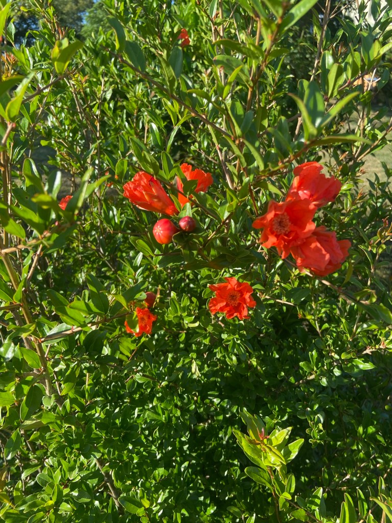 Unsere Granatapfelbüsche blühen! Und in diesem Jahr haben das erste Mal fast alle Büsche Blüten gebildet. Seit 6-8 Jahren stehen die Büsche im Park und als Reihe gepflanzt an der Hofeinfahrt. Es hat viel Arbeit und Geduld gekostet, bis wir sie endlich so weit hatten.