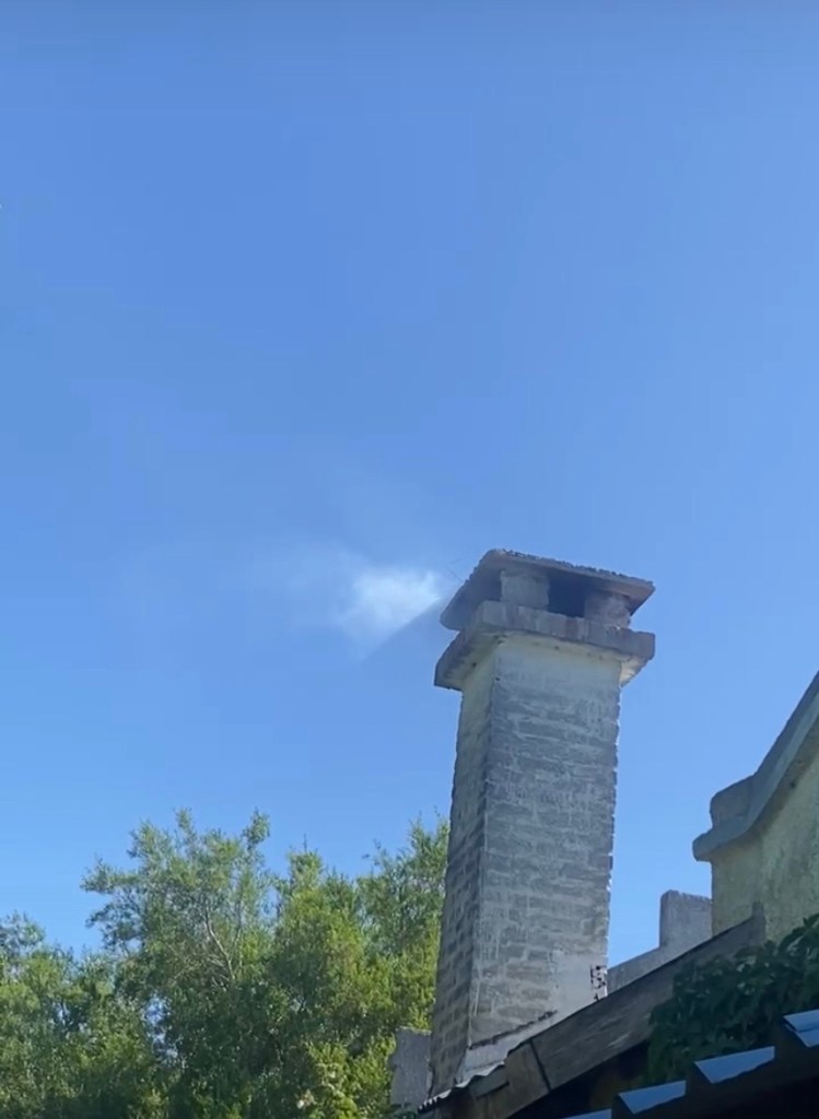 Bei strahlend blauem Himmel und 35 Grad Außentemperatur raucht nun der Kamin und verscheucht hoffentlich die Bienen. Sollen sie sich doch ein anderes Plätzchen suchen!