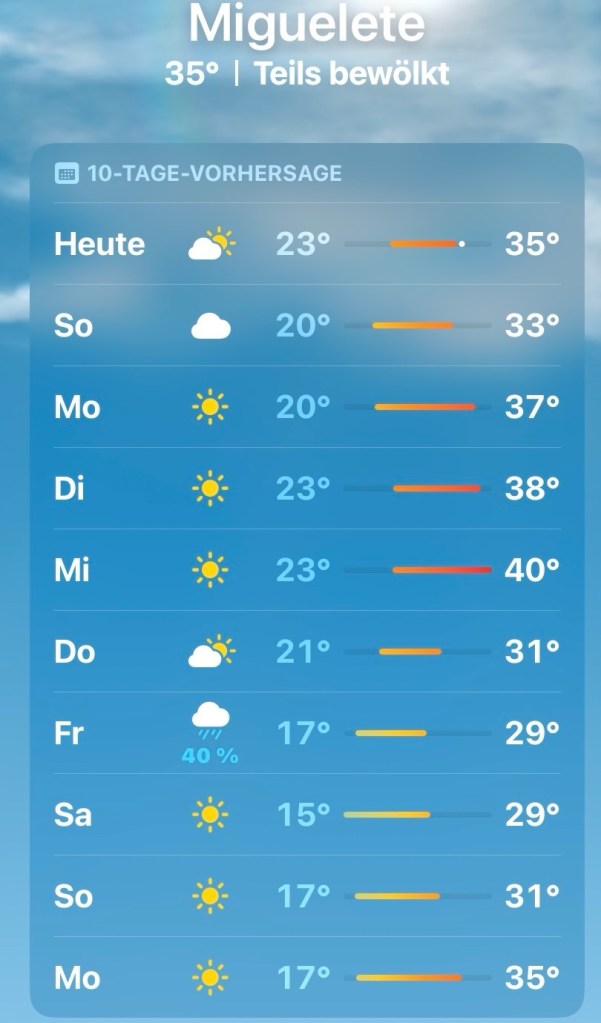 Seit vier Tagen schmoren wir unter einer Hitzeglocke. Die hohen Temperaturen lähmen die Energie. Mensch und Tier liegen im Schatten und hecheln vor sich hin.