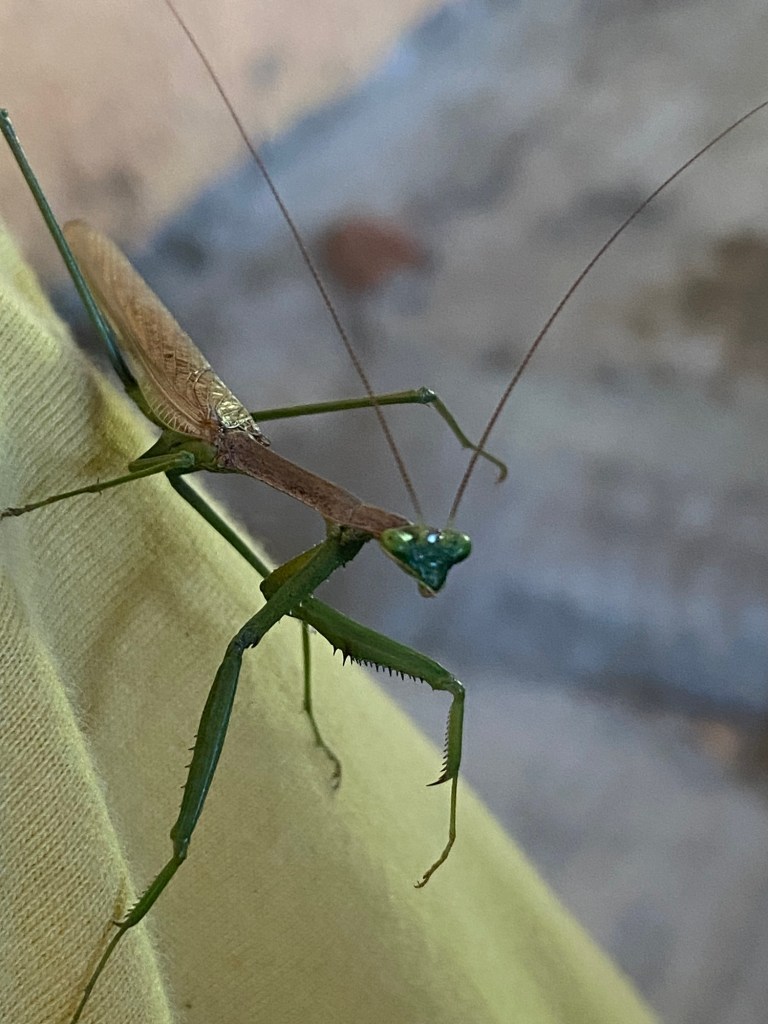 Bei uns im Park sind sie relativ häufig zu finden, wobei sie in unterschiedlichen Arten vertreten sind. Grasgrüne und hellbraune, die an vertrocknete Stöckchen erinnern, tummeln sich im Gebüsch und vorzugsweise in den Rosensträuchern. Sie verharren oft stundenlang völlig bewegungslos unter einem Blatt oder an einem Ast, bis ich mit dem Wasserschlauch komme und meine Rosen gieße. Dann kommt Bewegung ins Blattwerk und die Gottesanbeterin bewegt sich in Zeitlupentempo, einem Faultier gleich, in trockenere Gefilde.
